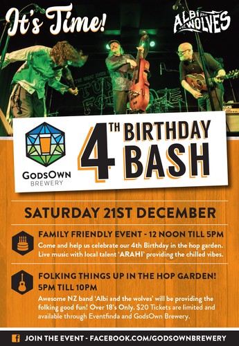 4th Birthday BashIt's time! GodsOwn Brewery are celebrating their 4th Birthday in the Hop Garden by providing chilled vibes and family entertainment with local talent from 'Arahi' from 12 noon to 5 pm. We will then be Folking ...