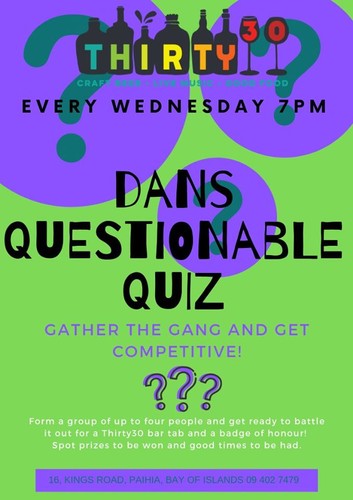 Dans Questionable QuizDans Questionable Quiz is back! Gather the gang and get competitive. Form a group of up to 4 people and get ready to battle it out for a Thirty30 bar tab and a badge of honour! Different round topics every ...