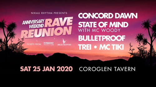 Anniversary Weekend Rave - ReunionConcord Dawn, State Of Mind (with MC Woody), Bulletproof, Trei, MC Tiki. It's been about 15 years since we started these shows at the Coroglen Tavern, and a good few years since we did one. This was the start of ...