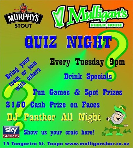 Mulligan's World Famous Quiz NightIf you are in Taupo on Tuesday - Do not miss this! The World famous Mulligan's Quiz Night in Taupo. Lots of fun. - Pub Quiz - Test you knowledge. - Fun games - Dance on the floor with DJ after quiz. - Food & ...